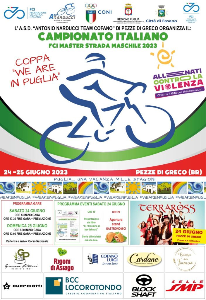 La bandiera tricolore sventola ancora a Pezze di Greco, alle porte di Fasano, per lo svolgimento dei Campionati Italiani Master FCI uomini โ Coppa We Are in Puglia sotto lโegida della Federazione Ciclistica Italiana sabato 24 e domenica 25 giugno.