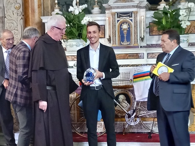 Al convento di Santa Lucia alla Castellina sede del Centro Spirituale della Federciclismo e del Museo Filotex, un altro premio di prestigio in Toscana per i campioni ed i personaggi del pedale, organizzato dal gruppo “Gli Amici del Ciclismo” presieduto da Luca Limberti con Giacinto Gelli, Alessandro Troni, Francesco Cocci. Quest’anno per la prima volta anche il premio Gastone Nencini. La premiazione al termine della celebrazione della Santa Messa all’interno della splendida chiesa. Il premio “Coraggio e Avanti” al ventitreenne professionista veneto Filippo Zana, Campione Italiano in linea: quello nel ricordo di Gastone Nencini al grande campione belga Roger De Vlaemink, un mito del ciclismo con le oltre 500 vittorie conseguite tra strada, pista e ciclocross, il Memorial Alfredo Martini Azzurri d’Italia a Giovanni Battaglin, il Memorial Franco Ballerini a due esponenti del calcio, Luciano Spalletti e Cristiano Giuntoli rispettivamente allenatore e direttore sportivo del Napoli impossibilitati ad essere presenti. Ed è stato Giuntoli via telefono ha portare il saluto così come ha fatto Battaglin. Premio Ammiraglio D’Oro a Davide Bramati direttore sportivo della Quick Step e del campione belga Remco Evenepoel, il Memorial Edo Gelli Over 35 al trentino Daniele Oss, per il ciclismo femminile alla bi-campionessa del mondo Martina Fidanza. Il premio David Faraoni per gli under 23 al Campione Italiano Lorenzo Germani, il Memorial Mario Sani allo junior pisano Federico Savino.