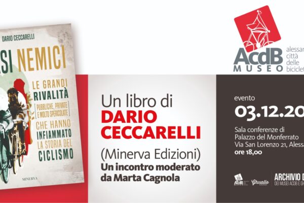 Alessandria Città delle Biciclette, novembre 2021 – Ripartono con la presentazione del nuovo libro edito Minerva, Quasi Nemici, di Dario Ceccarelli gli incontri che tengono allenate le biciclette del Museo AcdB di Alessandria, a Palazzo Monferrato, in via San Lorenzo 21. Il Museo Acdb ha deciso di iniziare una nuova serie di incontri che mirano a promuovere e valorizzare la cultura della bicicletta e lo spirito anche storico – sportivo che ha dato i natali al Museo, riaperto nei fine settimana dopo l’interruzione forzata dalla Pandemia, e che si affaccia ad una nuova epoca, per fare vivere dentro e fuori dalle sale espositive una storia infinita delle due ruote, uscendo dai confini alessandrini.