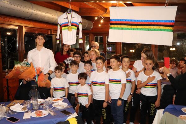 Pulica (FI), 19 settembre 2024 – Una serata iridata quella organizzata dal Velo Club Scuola Ciclismo Empoli del presidente Alberto Mazzoni, al proprio tesserato Fabio Del Medico, il diciottenne juniores versiliese di Crociale di Pietrasanta, che in agosto in Cina ha conquistato la prestigiosa maglia iridata su pista nella specialità del keirin. La sala del ristorante “Lo Spigo” a Pulica tra Montelupo e Montespertoli (il locale è uno degli sponsor della squadra empolese) addobbata con drappi iridati mentre tutti i componenti del folto gruppo dei giovanissimi del V.C. Scuola Ciclismo Empoli, hanno indossato una maglietta con i colori dell’iride. Tra i presenti il presidente del Comitato Regionale Toscana di ciclismo Saverio Metti e quello del Comitato Provinciale fiorentino Leonardo Gigli. Interviste, autografi, selfie, vari interventi degli ospiti, a elogiare lo splendido atleta in maglia iridata e campione italiano 2024 nella velocità, che ha ringraziato tutti confermando che resterà anche nel 2025 (salirà con il prossimo anno di categoria negli under 23) nel Velo Club Scuola Ciclismo Empoli una società che apprezza per impegno, serietà e passione. Del Medico ha raccontato anche la volata finale che gli consentì in Cina di conquistare la medaglia d’oro. Sembrava impossibile la rimonta a 50 metri dalla linea di arrivo, poi l’esplosione di potenza del versiliese nei confronti degli avversari e la sua gioia per il prestigioso successo conquistato, unita a quella di tutto lo staff azzurro della Nazionale.