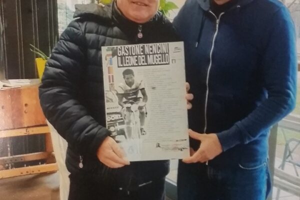PRATO – Nell’anno di ricorrenze particolari su Gastone Nencini, 90 anni dalla nascita (1 marzo 1930), 60 dalla vittoria al Tour de France (17 luglio 1960), 40 dalla morte (1 febbraio 19080), si è inserita la cerimonia svoltasi al “Nencini Bike” di via Bologna a Prato, gestito da anni da Saul Nencini, uno dei quattro figli del grande campione ricordato da tutti come il “Leone del Mugello”. Un ritrovo ed un incontro nel nome e nel ricordo commosso del Campione, è stata l’occasione per dedicargli una composizione poetica da parte del noto e brillante personaggio pratese Maurizio Colligiani, giudice di gara regionale di ciclismo con oltre 700 servizi effettuati, il quale nel tempo libero, ama scrivere e dedicare poesie ai campioni del ciclismo ed ai personaggi di questo sport. Maurizio ha donato la poesia “Gastone Nencini il Leone del Mugello” a Saul tra gli applausi dei presenti alla partecipata e bella cerimonia. Nella sua composizione lo scrittore di Galciana di Prato ricorda chi è stato Gastone Nencini, le sue sfide, il coraggio, la grinta, le doti di discesista che fanno parte della sua strepitosa carriera sportiva con le due gemme, la vittoria nel Giro d’Italia 1957 e nel Tour de France del 1960.