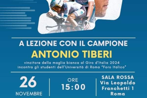 Martedi 26 p.v. alle ore 15,00 presso la Sala Rossa in via Leopoldo Franchetti 1 in Roma, il Campione di Ciclismo Antonio Tiberi incontrerà gli studenti dell’Università di Roma “Foro Italico”, nell’occasione interverrà anche la giovane promessa Eleonora La Bella: il giornalista del Corriere della Sera Marco Bonarrigo modererà la lezione.