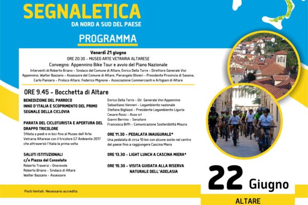 Il primo appuntamento inaugurale si terrà Sabato 22 giugno, alle 9.45 alla Bocchetta di Altare, con lo scoprimento del primo segnale della ciclovia. A seguire la parata del cicloturista, la consegna ufficiale del timbro e una pedalata tra le bellezze altaresi fino a Cascina Miera, all'interno della Riserva Naturale dell'Adelasia. Un tour che proseguirà fino al 10 agosto con eventi in ognuna della 44 tappe con la partecipazione di centinaia di Istituzioni locali e nazionali, durante il quale sarà illustrato il Piano Nazionale di Sviluppo Sostenibile dell'Appennino finalizzato a strutturare una governance per le aree interne d'Italia.