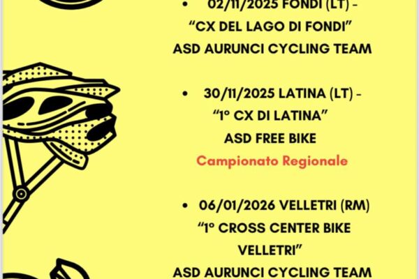 Domenica prossima partirà la stagione ciclocross del Lazio con la prima tappa del circuito CLC in programma a Fondi con la particolare dedica alla memoria di Benedetto Iacovacci. Sarà l’Aurunci Cycling Team a mettere in scena la prima edizione del CX del Lago di Fondi che si svolgerà su un circuito completamente sterrato realizzato nell’area del Parco del Lago di Fondi e sarà prova unica di Campionato Provinciale per i residenti in provincia di Latina tesserati nelle categorie agonistiche. Un evento pronto a accogliere gli specialisti del fango del centro Italia che anche in questa stagione sono numerosi come testimoniano le prime gare disputate. Il programma prevede il ritrovo alle ore 7.30 in via Suggerelle località Salto di Fondi e l’apertura della segreteria per la verifica tessere e il ritiro dorsali. Alle 9.30 ci sarà lo start della prima batteria sulla distanza di 40 minuti che vedrà in gara Juniores, Junior Master Sport, M4, M5, M6, M7, M8, M9 e tutte le Donne della fascia internazionale e Master.
