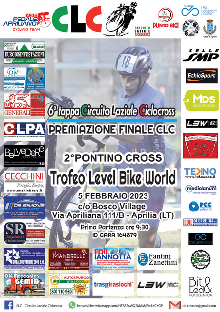 Si avvicina l’ultimo atto del Circuito Laziale Ciclocross che andrà in scena Domenica 5 Febbraio ad Aprilia nell’area de “Il bosco village” sulla via Apriliana, messa gentilmente a disposizione dai titolari. Ad organizzare la seconda edizione del Pontino Cross Trofeo Level Bike World sarà il Pedale Apriliano di Massimo Saurini in stretta sinergia con la Punto Bici di Alfio Sciuto e con la collaborazione dell’assessore allo sport del Comune di Aprilia Luana Caporaso. La gara sarà anche prova di Campionato Provinciale per la sola categoria Esordienti 1° anno M/F. Attesi al via tutti i protagonisti del CLC pronti a giocarsi l’ultima chance per migliorare o confermare la propria posizione di classifica ed avere accesso alla premiazione finale del circuito che si svolgerà al termine delle gare di giornata. Massimo Saurini, nella doppia veste di responsabile organizzativo e presidente del CP Latina, sta curando attentamente l’evento che chiude la lunga stagione del ciclocross laziale anche quest’anno ricca di gare e partecipanti.