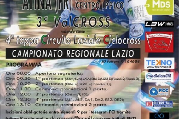 Sarà una giornata di grande ciclismo quella che domenica prossima andrà in scena ad Atina in provincia di Frosinone. Ad aprire il denso programma sarà il campionato regionale ciclocross per tutte le categorie del Comitato Regionale Lazio presieduto da Maurizio Brilli. La location di lusso dell’evento sarà il prestigioso Centro Ippico di Atina in localita Ponte Melfa che per un giorno diventerà il palcoscenico delle bici da cross. La terza edizione del Valcocross, quarta tappa del Circuito Laziale Ciclocross, organizzata dalla Fun Bike del presidente Mario Soave, prenderà il via alle 9.30 con la batteria delle categorie Juniores, Master da M4 a M8 e Donne Open e Master. A Seguire la partenza di Open e Master da Elmt fino ad M3.