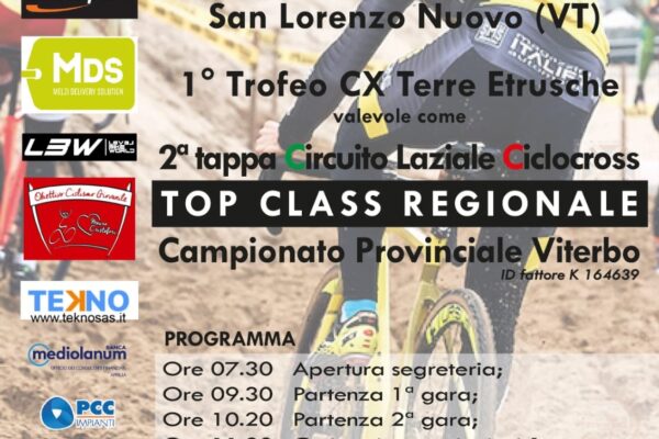 Saranno oltre 200 in gara nella prima edizione del Trofeo Cross Terre Etrusche in programma Martedì 1 Novembre a S.Lorenzo Nuovo in provincia di Viterbo. La gara Top Class fa parte del Circuito Laziale Ciclocross Memorial Mauro Cristoforied è organizzata dal Team Centro Italia Scuola di Ciclismo presieduto da Pierangelo Brinchi, vice presidente del CR Lazio. Un appuntamento importante che riporta in provincia di Viterbo il ciclocross dopo qualche anno di assenza e che sarà valida come Campionato Provinciale del Comitato guidato da Giancarlo Pozzi. Il ritrovo per Giuria e partecipanti è fissato alle 7.30 in Piazza Europa mentre il via alla prima gara di giornata verrà dato alle 9.30 presso l’ex Campo Sportivo di S.Lorenzo Nuovo. Si comincerà con Juniores, JMT , Master 2^ e 3^ fascia e Donne. Alle 10.20 partiranno Open e Master 1^ fascia e a seguire le affollate gare giovanili che si apriranno alle 11.45 con i Giovanissimi G6 per proseguire poi con Allievi ed Esordienti alle 12.10. Un programma denso che regalerà un’appassionante spettacolo a quanti verranno ad assistere all’evento. A curare la segreteria della manifestazione saranno come sempre Luca Adipietro e Roberto Soave mentre Alfio Sciuto e Armando Mattacchioni avranno l’oneroso incarico della supervisione dell’intero evento. Per il Circuito Laziale Ciclocross dopo l’ottimo debutto di Pescosolido, la gara viterbese sarà una importante banco di prova in vista delle altre quattro tappe (Formia, Atina, Trevignano ed Aprilia) che completeranno la challenge organizzata dalle società Aurunci Cycling Team, Ciclisti Sorani, Pedale Apriliano, Corridori per sempre, Punto Bici Aprilia , Fun Bike e Team Centro Italia.