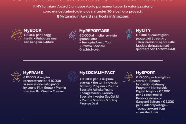 In palio premi in denaro e opportunità concrete, per ogni altra maggiore informazione si rimanda al Regolamento del Premio pubblicato sul sito https://myllenniumaward.org/mysport/.
