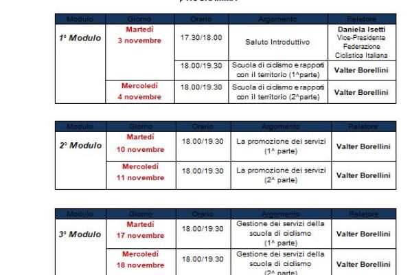 In programma a novembre 2020 un progetto di formazione dedicato ai Direttori di Scuole di ciclismo, erogato in modalità online sulla piattaforma ZOOM della FCI. Il corso sarà suddiviso in 3 unità didattiche, un laboratorio ed un workshop, in programma il 24 novembre. Docente del corso sarà il professor Valter Borellini.
