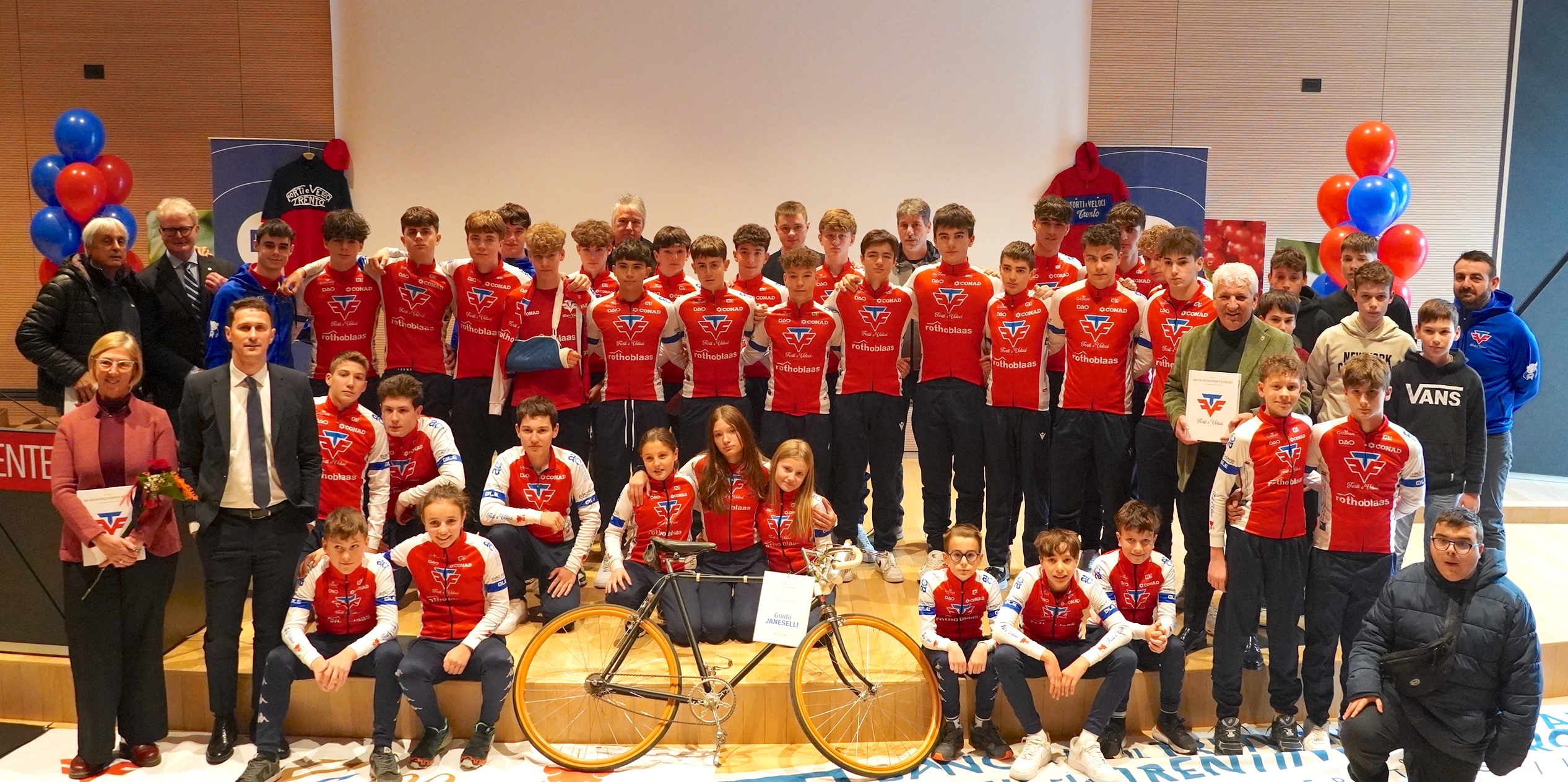 Alla celebrazione del centenario hanno preso parte tutti i rappresentanti degli sponsor e le autorità del mondo politico e sportivo, quali il presidente del Consiglio della Provincia Autonoma di Trento Claudio Soini, l’assessore provinciale Mario Tonina, i presidenti del Comitato Trentino di Federciclismo e Coni Renato Beber e Paola Mora (con tanto di consegna alla società di una targa celebrativa dei 100 anni), quindi il numero 1 della Federciclismo altoatesina Paolo Appoloni (spalleggiato dal presidente onorario Nino Lazzarotto) e le autorità locali, tra cui l’assessora del Comune di Trento Franca Frizzera e la collega del Comune di Pergine Valsugana Roberta Bergamo. Sono intervenuti anche Franco Demozzi, Giovannina Collanega, Dario Broccardo, Paolo Castelli, Franco Panizza, Walter Kaswalder ed Elena Nardelli, moglie di Marcello Osler, oltre ai rappresentanti degli sponsor Nicola Webber e Silvia Maurina (Dao), Elia Veronesi (Rothoblaas), Alessandro Ambrosi (Ambrosi Meccanica) ed Ermanno Villotti (Banca Trentino-Südtirol), non ultimo il nutrizionista dottor Alfonso Presutto, con cui la Forti e Veloci ha avviato una proficua collaborazione. Guardando avanti, verso nuovi e ambiziosi traguardi.