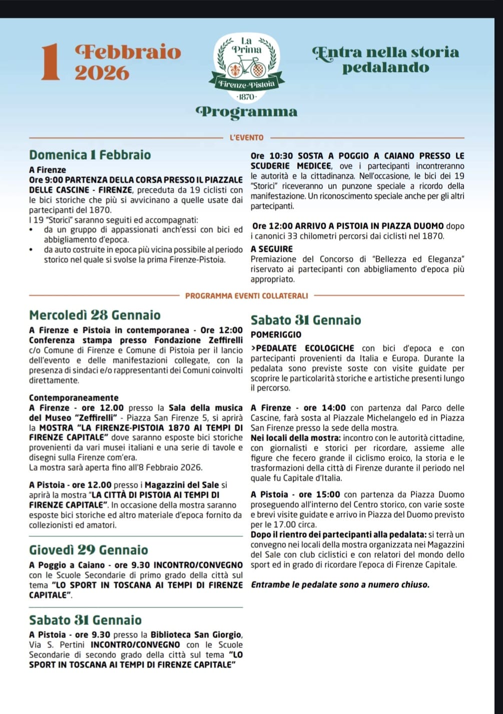 La tradizione ciclistica italiana rinnova uno dei suoi appuntamenti più simbolici con La Firenze‑Pistoia 1870 – Rievocazione storica, in programma domenica 1° febbraio 2026. L’evento, inserito nel calendario ufficiale della Federazione Ciclistica Italiana, è una manifestazione non competitiva di tipo ciclostorico, aperta a tutte le categorie, tesserati e convenzionati FCI.