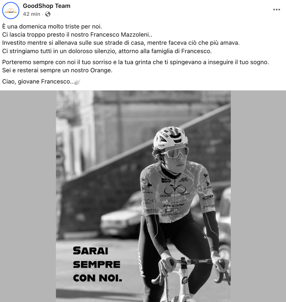 Il mondo del ciclismo piange l’ennesima vittima della strada. Nella giornata di oggi è scomparso Francesco Mazzoleni, corridore bergamasco di 18 anni del Team Goodshop Yoyogurt, investito mentre si allenava sulle strade di casa. A darne notizia la stessa squadra piemontese attraverso un messaggio diffuso sui propri canali ufficiali: “È una domenica molto triste per noi. Ci lascia troppo presto il nostro Francesco Mazzoleni. Investito mentre si allenava sulle sue strade di casa, mentre faceva ciò che più amava. Ci stringiamo tutti in un doloroso silenzio, attorno alla famiglia di Francesco. Porteremo sempre con noi il tuo sorriso e la tua grinta che ti spingevano a inseguire il tuo sogno. Sei e resterai sempre un nostro Orange. Ciao, giovane Francesco”.
