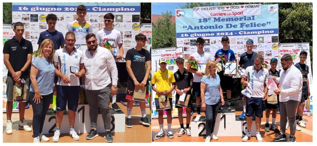 In quarta posizione finiva il campano Gennaro Matrone (Team Cesaro Franco Ballerini) e Cristian Di Paolo (Velosport Ferentino Ciclisti Sorani) si piazzava al quinto posto. Tanti gli ospiti venuti ad onorare il Memorial Antonio De Felice e fra questi la sindaca di Ciampino Emanuela Colella e il consigliere delegato allo sport Emilio Biondi, il presidente del CR Lazio Maurizio Brilli, il vice Tony Vernile, il consigliere Alfio Sciuto e il tecnico regionale Aldo Delle Cese. Presente per la vestizione delle maglie del CP Romano il consigliere Marco Ciccolini che ha fatto indossare i colori giallorossi a Christian Di Rosa, Livia Rossi, Davide Sellati, Serena Del Grosso e Lorenzo Ferraro. Ringraziamenti finali di Maurizio De Felice in primis al Comune di Ciampino e ai Comandanti delle Polizie Locali Roberto Antonelli (Ciampino) e Giulio Bussimello (Marino). A seguire il grazie alle numerose associazioni che hanno collaborato con la Ciampino Bike: la protezione civile di Ciampino, l’Ass. Carabinieri in pensione, l’Ass. Vigili Urbani in pensione, l’Ass. Polizia Nazionale di Stato, la Croce Rossa di Ciampino, le scorte tecniche del Team Andrea Vessella, il GS Santa Maria delle Mole, il Team 021, il Circolo Cipollaro e il gruppo dei Ciclisti Ieri Oggi e Domani presenti alla premiazione con Giovanni Del Duca ed Edoardo D’Amico. Lungo anche l’elenco degli sponsor vicini all’organizzazione del Memorial Antonio De Felice: ELLE Hair Beauty, Caffè Caroli Via dell'Ospedaletto, Edil Conte materiali edili Via dell'Ospedaletto, Cycle ‘n Cycle, Bar Bova Via Mura dei Francesi, Abitare Consulting Agenzia Immobiliare di Anna Berardi , Geal Color distributore esclusivo Sikkens, Artigiana Edile di Aletto Renato, Autogrup Primavera, La Briciola Ciampino, Caffè Martella torrefazione, Vacanzopoli agenzia di viaggi, Coperlegno, Global insurance infortunistica stradale-Risarcimento danni,Carrozzeria Oropallo, Caffetteria Bistrot Contatto, Celletti, Autofficina Stefano Cappella Frosinone, Ristorante Sapore del mare 2, Ristorante Viola Lariano, Marrocco design Costruzioni e arredamenti di Giovanni Marrocco, Supercar di Pierluigi Mancini, Vivai Graziella, Casale Bagaglini a Velletri, Norcineria di Montini Sergio Velletri, Borcea Dinu, ristrutturazioni edili, Gioielleria Gagliardi Santa Maria delle Mole, Agenzia Immobiliare di Roberto Maggioli ad Albano Laziale, LEVEL BIKE WORLD abbigliamento per il ciclismo di Impemba Angelo, Supermercati DEM, Guido Berardi costruzioni.