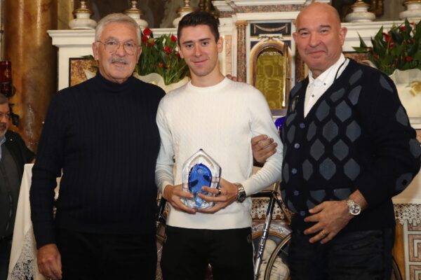 S. Lucia alla Castellina,24 novembre – Il Premio “Coraggio e Avanti” organizzato dal Gruppo Amici del Ciclismo presieduto da Luca Limberti, ha festeggiato il ventennale presso la sua sede, quella del convento dei Padri Carmelitani, conosciuto come Centro Spirituale del Ciclismo e che ospita anche il Museo Filotex sulla collina di S.Lucia alla Castellina. La celebrazione della Santa Messa ha aperto il programma, quindi in chiesa la festosa premiazione a campioni del passato, del presente e quella a future speranze. Il premio “Coraggio e Avanti” a Antonio Tiberi: “Sono contento della stagione 2024 con il quinto posto al Giro d’Italia e il primo posto nella classifica dei giovani. L’anno prossimo cercherò di migliorare il mio rendimento, preparandomi bene per la corsa rosa e far bene. Sarà una stagione importante quella del prossimo anno”.