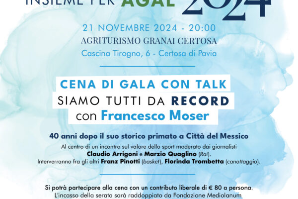 La cena annuale di beneficenza che organizza AGAL – associazione che si occupa delle famiglie dei bambini leucemici e che opera in stretta collaborazione con il San Matteo di Pavia – si arricchisce quest’anno di emozioni da record. Prima di tutto per la presenza del campione trentino che sarà al centro di una cena di gala con talk moderato dai giornalisti Rai Claudio Arrigoni e Marzio Quaglino.