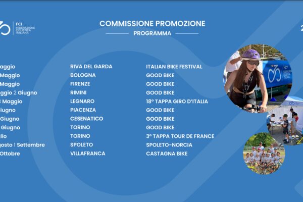 Riparte l’attività della Commissione Promozione della Federazione Ciclistica Italiana, che anche nel corso del 2024 proseguirà il suo percorso di promozione del ciclismo come attività ludica a livello giovanile, l'educazione stradale e la mobilita` in sicurezza, attraverso il divertimento. Dopo il successo delle scorse stagioni, anche quest’anno il programma della Commissione, presieduta dal Vicepresidente federale Ruggero Cazzaniga, risulta molto ricco: 11 gli eventi in cui è confermata la presenza del gruppo di lavoro promozionale, che arricchirà i vari palinsesti con uno stand all’interno del quale appassionati e curiosi avranno la possibilità di conoscere le tante attività federali, mentre per i più piccoli sarà un’occasione speciale per avvicinarsi al nostro sport con il supporto di tecnici specializzati.