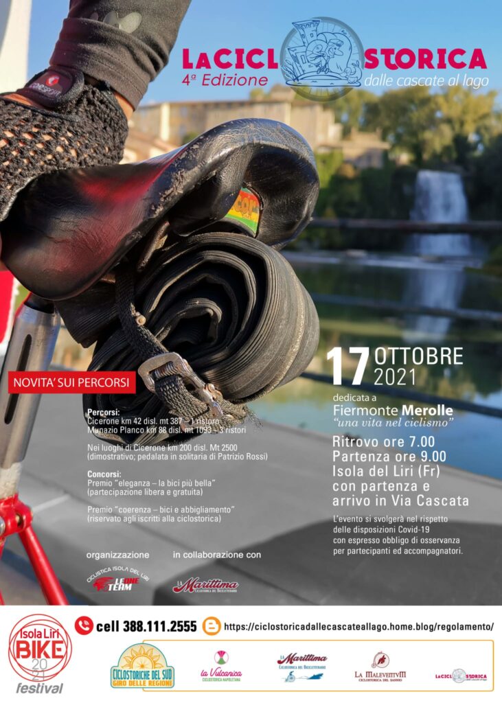 Torna a rivivere il ciclismo d’epoca in Ciociaria grazie alla quarta edizione della Ciclostorica “Dalle cascate al lago”, manifestazione cicloturistica non competitiva con partenza ed arrivo ad Isola del Liri . A curare l’organizzazione sarà la Ciclistica Isola del Liri Leone Team che ha voluto dedicare l’evento di quest’anno a Fiermonte Merolle, amico e appassionato di ciclismo scomparso di recente, grande sostenitore della manifestazione sin dalla prima edizione. La ciclostorica ha l’obiettivo di far rivivere biciclette d’altri tempi sulle strade della media valle del Liri e della Val Comino.
