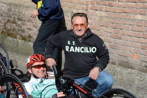 Nell’immagine Mario Bonissi con un atleta del team handbike durante una gara