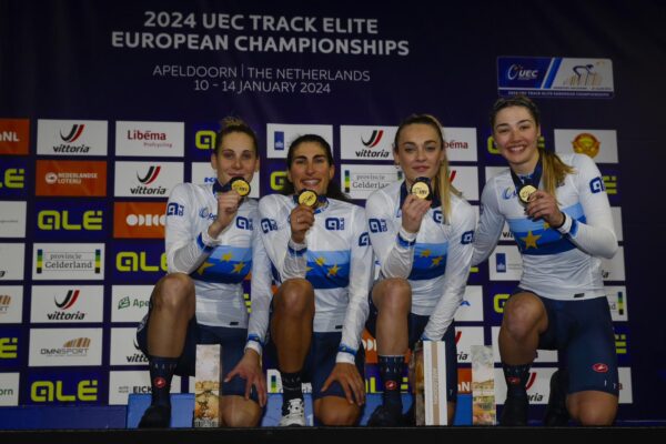 Il settore endurance dell’Italia si conferma punto di riferimento in Europa. Nel secondo giorno di gare ad Apeldoorn il quartetto femminile composto da Elisa Balsamo, Vittoria Guazzini, Martina Fidanza e Letizia Paternoster supera la Gran Bretagna campione del mondo e sale sul gradino più alto del podio (4’12″551). Poco prima il quartetto maschile composto da Jonthan Milan, Davide Boscaro, Francesco Lamon e Simone Consonni aveva conquistato il bronzo contro la Germania, migliorando ancora il tempo (3’49″974). Oro alla Gran Bretagna che supera i campioni del mondo della Danimarca.