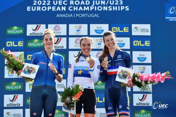Anadia (07/07) – E’ Vittoria Guazzini a regalare all’Italia la prima medaglia di questi Campionati Europei strada per Juniores e Under 23. La ventunenne di Pontedera, che appena una settimana fa si è imposta nella prova contro il tempo ai Giochi del Mediterraneo di Orano, conquista infatti il secondo gradino del podio nella prova a cronometro dedicata alle U23. Appena undici i secondi di distacco dalla neerlandese Shirin van Anrooij, a cui l’azzurra lascia il trono ed il titolo di campionessa europea di questa specialità.
