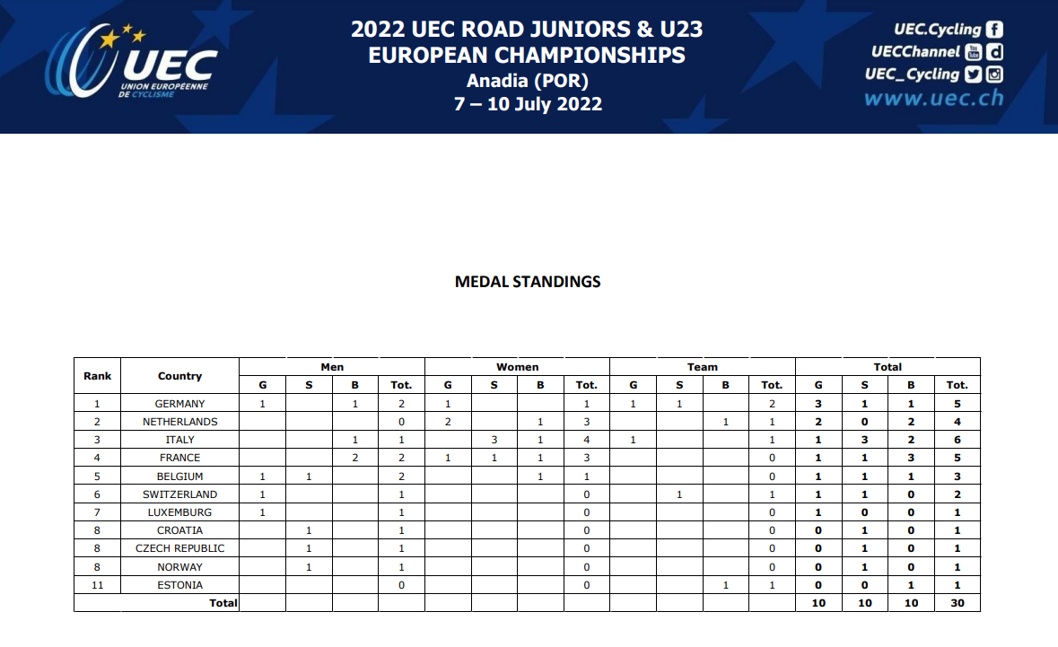 Anadia (12/07) – “Una sola squadra”: è questo il motto che ha guidato l’Italia durante questi Europei strada per Juniores e Under 23. Sui tracciati di Anadia condivisione, unione e ambizione hanno garantito all’Italia un ruolo da protagonista, superando a pieni voti l’ultimo test in vista del Mondiale in Australia. Un oro, tre argenti e due bronzi che portano il gruppo azzurro al primo posto del medagliere per metalli complessivi, superando Francia, Germania e Olanda. Il terzo per ori conquistati.