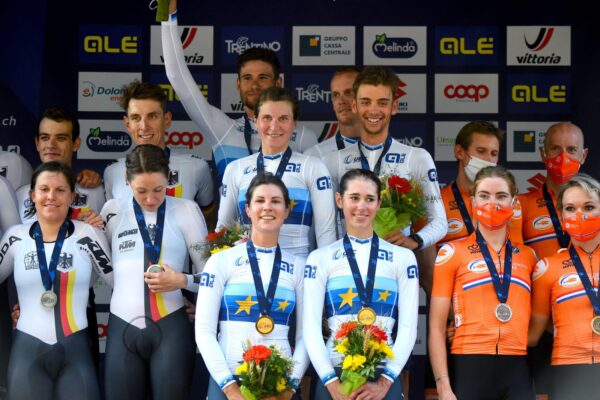 TRENTO – L’Italia apre alla grande l'edizione 2021 dei Campionati Europei strada. Dopo le belle top ten raggiunte nelle crono individuali juniores, gli azzurri Elite volano e si prendono l'oro nel Mixed Team Relay, la staffetta mista a squadre. In una prova che ci vedeva partire favoriti al pari dell'Olanda sin dalla vigilia, l'Italia è subito volata al comando e non si è più voltata indietro. E' infatti partito subito forte il sestetto azzurro, che con Filippo Ganna, Matteo Sobrero e Alessandro De Marchi segna il miglior intertempo (12’ 21” 39), 12 secondi meglio dell’Olanda. Il distacco raddoppia all’arrivo, con Ganna e Sobrero che danno il cambio con un vantaggio consistente.