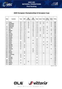 Il primo posto nel Medagliere trova solo parzialmente riscontro nella classifica per Nazioni nella quale l’Italia è sesta, con 532 punti, alle spalle di Francia, Gran Bretagna, Olanda, Svizzera e Germania. Nel dettaglio per singole discipline, chiudiamo al terzo posto nella Pista e Strada, al secondo nel MTB e nel ciclocross, al primo posto nel Gravel. Paghiamo l’assenza di punti nel BMX Freestyle e nell’Indoor Cycling.