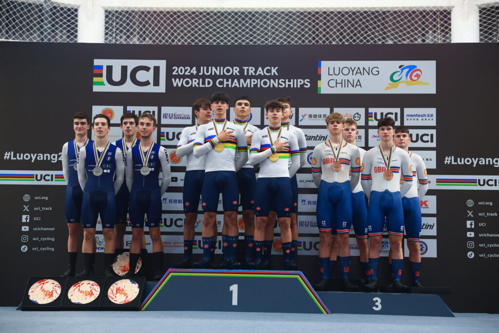 LUOYANG (22/08) – Sale a quota 6 il conto delle medaglie azzurre nella rassegna mondiale su pista di Luoyang, dedicata alla categoria juniores. Sull’anello cinese l’Italia continua il suo dominio, salendo ben 4 volte sul podio nella seconda giornata di gare. Due i titoli mondiali conquistati: il primo con il quartetto maschile composto da Davide Stella, Ares Costa, Christian Fantini e Alessio Magagnotti (più Eros Sporzon, in gara al primo turno), che in finale hanno letteralmente schiacciato la Francia, ritoccando ulteriormente il record del mondo, portandolo dai 3:53.562 delle qualifiche di ieri ai 3:51.199 di oggi.