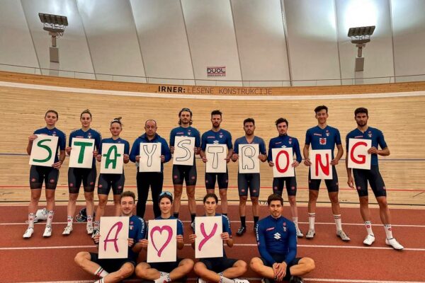 Nella foto gli azzurri con un messaggio per Amy Pieters, la ciclista olandese, campionessa del mondo di Madison, caduta prima di Natale mentre si allenava con la sua squadra ad Alicante.