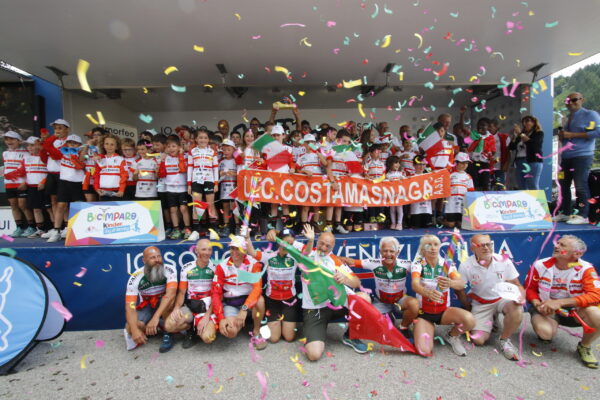 TARVISIO (23/06) – Cala il sipario sulla 36esima edizione del Meeting Nazionale di Società per Giovanissimi e a trionfare è ancora una volta l’UC Costamasnaga. Sulle strade di Tarvisio arriva la terza vittoria consecutiva per il team lombardo, dopo i successi ottenuti a Conegliano nel 2022 e a Montesilvano nel 2023: la squadra lecchese, tra le più numerose delle 151 rappresentative partecipanti, ha sbaragliato la concorrenza trionfando con 403 punti di vantaggio sul G.S. Mosole, che si piazza in seconda posizione di fronte all’ASD Sprint Vidor La Vallata, che si è aggiudicata la terza piazza ed il premio Franco Ballerini la miglior coreografia nella sfilata di apertura.