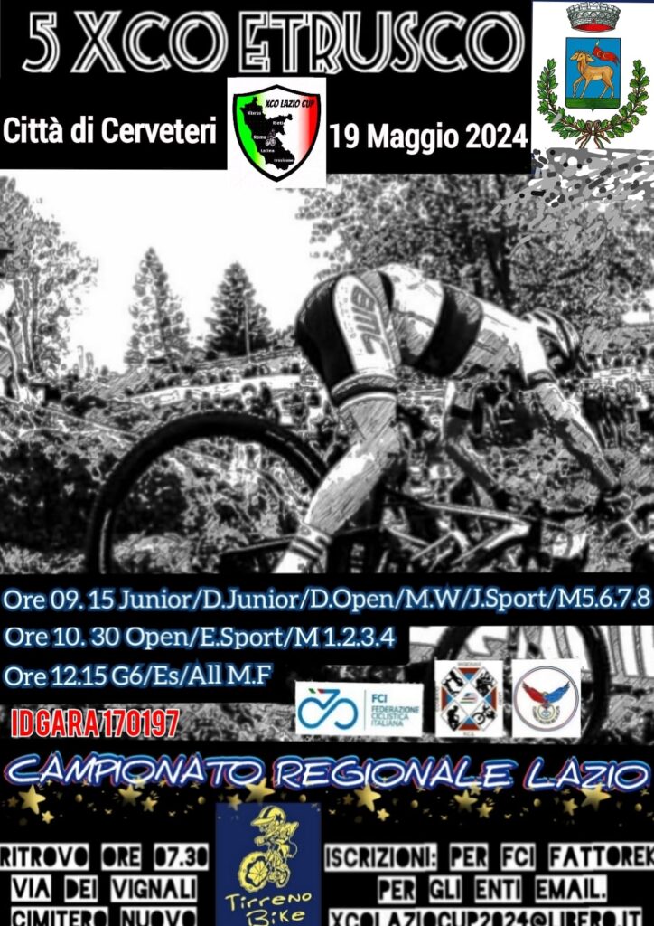 Sarà l'XCO Etrusco Citta’ di Cerveteri organizzato dalla Tirreno Bike a decretare i campioni laziali XCO per la stagione in corso. La gara assegnerà anche i punti dell'XCO LAZIO CUP, il circuito laziale delle gare cross country giunto alla sua quarta tappa. Location dell'evento sarà l’area adiacente alla necropoli della Banditaccia su cui la Tirreno Bike ha lavorato da diverse settimane per disegnare il percorso di gara. Un tracciato dove oltre alla tecnica di guida verrà messa a dura prova la tattica di gara. L'appuntamento per le operazioni pregara e alle ore 7 in via dei Vignali nei pressi del nuovo Cimitero mentre la prima partenza è fissata alle 9.15 e vedrà scattare Juniores, Donne e Master 2^ fascia. Alle 10.30 invece partirà la prova più lunga del programma, quella riservata ad Open e Master 1^ fascia. L’ultimo start di giornata, sicuramente il più numeroso, vedrà in griglia Allievi, Esordienti e Promozionale G6 ed è previsto alle 12.15.