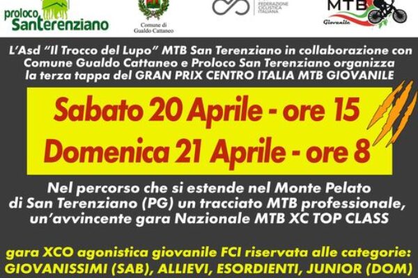 Terza tappa del circuito del Gran Prix Centro Italia Mtb Giovanile, con il calendario dell’ importante circuito nazionale, che farà tappa, il 21 aprile, a San Terenziano di Gualdo Cattaneo in provincia di Perugia. La dinamica società dell’Asd Il Trocco del Lupo, può ritenersi soddisfatta dell’esito delle precedenti edizioni, ma giustamente, spera che in questa stagione, ci possa essere un incremento di bikers. Comitato che ha allestito qualche variazione al tracciato, rendendolo ulteriormente più tecnico ed interessante. L'associazione MTB San Terenziano nasce dalla volontà di alcuni amici che, appassionati di Mountain Bike, avevano deciso di dare vita a questo gruppo ed organizzare la Gara Country Cross di San Terenziano. Attualmente il progetto è quello di tenere percorribile il percorso della gara tutto l'anno e di creare un contesto favorevole al turismo ciclistico. L'attività si è poi indirizzata verso le gare dedicate ai più giovani ed è quindi da vari anni che organizziamo nel nostro paese una gara nazionale giovanile dedicata a tutte le categorie: giovanissimi, allievi, esordienti e junior. Il percorso si snoda in un circuito sul monte Pelato, ricordando che la manifestazione ha l’etichetta di Top Class, e che al sabato, ci sarà lo spazio, e vetrina, per le gare riservate ai Giovanissimi (7/12 anni). In allegato la locandina