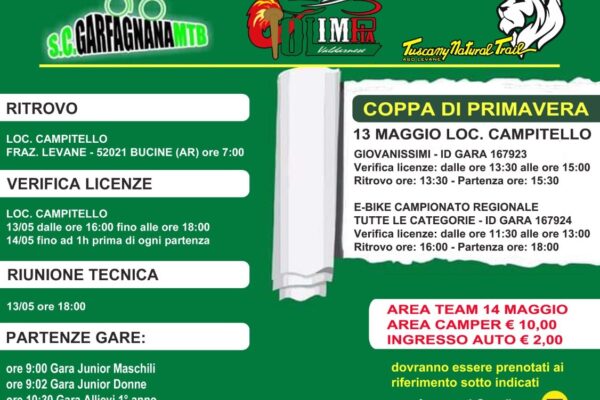 Un fine settimana decisamente particolare per la localita` aretina di Bucine, comune pronto per ospitare la due giorni di mtb, che tocchera` da vicino il movimento dei Giovanissimi (7/12 anni) gara che si disputera` il giorno di sabato 13 maggio, il mondo delle E-Bike (sempre sabato), ma soprattutto domenica, con l’ultima prova del nostro circuito nazionale, con la presenza degli Junior (17/18 anni), Allievi (15/16 anni) ed Esordienti (13/14 anni). Ci saranno delle gare nelle quali dovranno presentarsi atleti che sono ancora in lotta per la vittoria finale, per la conquista del podio, per la top five o “semplicemente” per cercare di guadagnare delle posizioni importanti nella generale. Questo vale anche per la classifica di societa`. La Sc Garfagnana, societa` impegnata a livello organizzativo, ha voluto investire su questa nuova localita` aretina, Bucine, per aumentare un certo interesse del territorio, sia sotto l’aspetto sportivo, ma anche toccando da vicino valori importanti che regala la zona della provincia di Arezzo. “Un ringraziamento particolare alla locale amministrazione comunale, Olimpia Valdarnese, Garfagnana Mtb e Tuscany Natural Trail”.