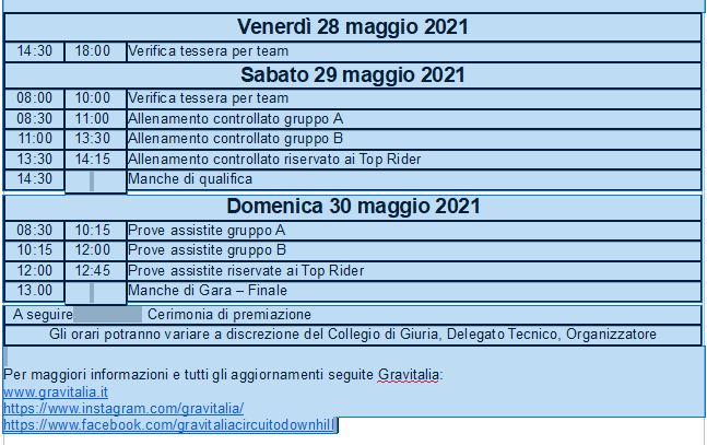 Il programma di gara prevede come sempre manche di qualificazione al sabato e gara la domenica secondo la seguente scaletta:
