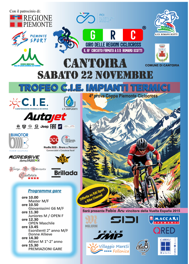 CANTOIRA (TO) – Il Giro delle Regioni Ciclocross si prepara a vivere il suo epilogo più atteso: il borgo montano di Cantoira, incastonato nel cuore delle Valli di Lanzo, sarà teatro della quinta e ultima tappa del circuito, valida per il Trofeo C.I.E. Impianti Elettrici e come quarta prova della Coppa Piemonte Ciclocross. Una giornata che si annuncia ricca di emozioni, sport e festa, sotto la regia dell’ASD Romano Scotti, storica realtà del ciclocross italiano, con il patrocinio di Regione Piemonte, Comune di Cantoira, Unione Montana Valli di Lanzo, Ceronda e Casternone e Piemonte Sport, e il supporto del GS Brunero 1906.