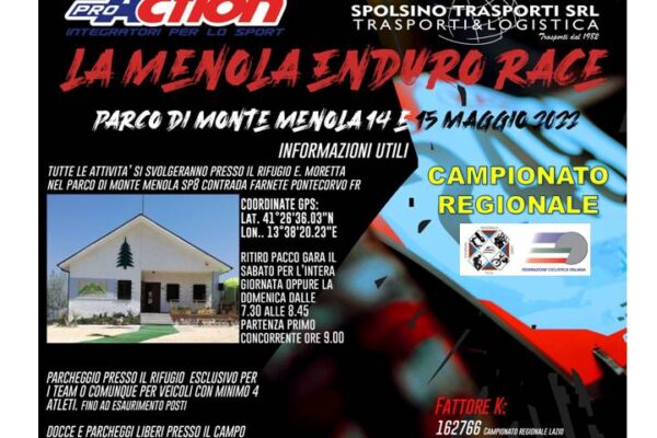 Appuntamento con l’enduro Domenica prossima nel Lazio con la prova unica di Campionato Regionale in programma a Pontecorvo per l’organizzazione del team Bikextreme dei fratelli Alfano dell’Animafamily di Gianfranco Caporuscio. La gara è la prima edizione de LA MENOLA ENDURO RACE e si svolgerà nella suggestiva cornice del Parco di Monte Menola. Da diversi mesi lo staff che cura l’evento sta lavorando per preparare al meglio i tracciati delle prove speciali ed offrire agli oltre 100 partecipanti un evento di grossa levatura. La prova è inserita nel circuito ENDURO SUD ITALIA 2022 e richiamerà i migliori specialisti del centro sud. Il quartier generale dell’evento sarà il rifugio E.Moretta in contrada Farnete di Pontecorvo nel Parco di Monte Menola. Proprio qui Sabato per l’intera giornata sarà possibile ritirare il pacco gara mentre Domenica la consegna avverrà dalle 7.30 alle 8.45. La partenza del primo biker è fissata alle ore 9 e da lì inizierà la lotta per conquistare le ambite maglie di Campione Regionale per tutte le categorie compresi i Master. Gli organizzatori hanno riservato uno spazio anche a chi vuole gareggiare con le e.bike proprio per coinvolgere il maggior numero di appassionati di Enduro. A fare da contorno all’evento ci saranno test bike ed e-bike GIANT della BXT , eventi per bambini curati dalla Pontebikecorvo e spazi dedicati alla musica ed al food. Sarà presente alla giornata pontecorvese il Comitato Provinciale FCI di Frosinone con il suo presidente Roberto Soave che ha spinto tantissimo per il rilancio dell’Enduro in Ciociaria, e la provincia avrà anche un’altra manifestazione a Cervaro il 4 Settembre con l’organizzazione della ASD Cervaro Enduro.