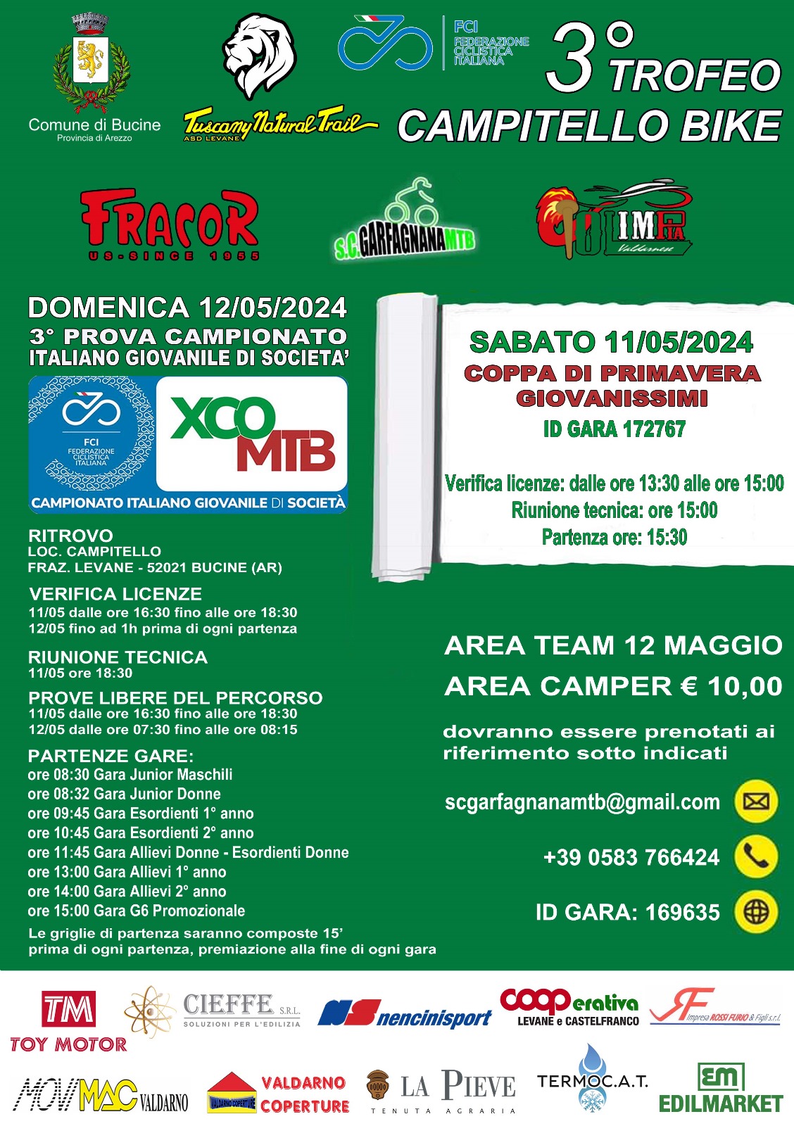 Alla domenica, grande evento nazionale con la terza prova del Campionato Italiano Giovanile di Società. Un evento straordinario per la società organizzatrice della Us Fracor Since 1995, che ha trovato un importante collaborazione dal gruppo di lavoro della Sc Garfagnana e della Tuscany Natural Trail Asd Levane. In programma il terzo trofeo Campitello Bike ed un sentito ringraziamento va rimarcato alla locale amministrazione comunale di Bucine e tutti gli sponsor che sono a fianco del comitato organizzatore.