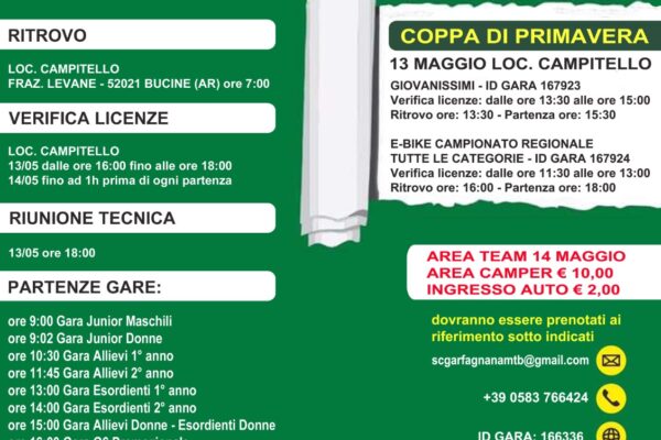 Tutto questo per quanto concerne l’orario di partenze, il percorso, l’organizzazione. C’è tanta attenzione nella nuova location che attende i bikers impegnati nel “nostro” circuito. Alle spalle una società, quella organizzatrice, che vanta già un importante esperienza organizzativa. Lo ricordiamo, che il 14 maggio a in località Campitello di Levane di Bucine, in provincia di Arezzo, si terrà la quinta ed ultima prova del Gran Prix Centro Italia Mtb Giovanile. In cabina di regia la Sc Garfagnana società che aveva già ospitato, in quel di Barga (Lucca) alcune prove del circuito nazionale. Ma è importante segnalare che nella giornata di sabato, si terrà anche la gara riservata ai Giovanissimi (7/12 anni), e questo è importante perché alcune società del territorio nazionale, possono aderire alla gara di domenica con i propri atleti delle categorie agonistiche giovanili (Esordienti, Allievi e Junior) ma anche portare i propri Giovanissimi (7/12 anni), per trascorrere uno splendido week-end agonistico, in una zona davvero straordinaria territorio ricco di attrattive naturali e storiche, rendendo il passaggio e itinerario obbligato per chi ricerca la semplice e tradizionale toscanità.