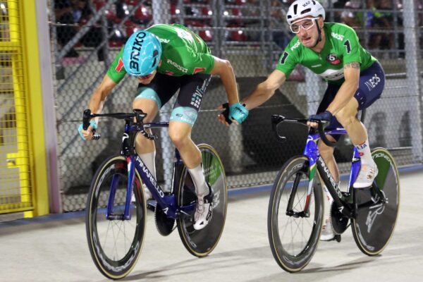 02/07/2024 – Al Velodromo “Attilio Pavesi” di Fiorenzuola d’Arda la 6 Giorni delle Rose Internazionale ha visto concludersi la quarta serata di gare. In questa giornata è iniziata la madison (o “americana”) maschile, gara a coppie che andrà avanti fino a giovedì. Dopo la prima prova e il primo giro lanciato (che concorre a formare la classifica generale della madison) leader della classifica generale sono Lev Gonov e Ivan Smirnov, coppia in maglia Rosti, che ha fine serata ha indossato la maglia bianca Siderpighi di leader.
