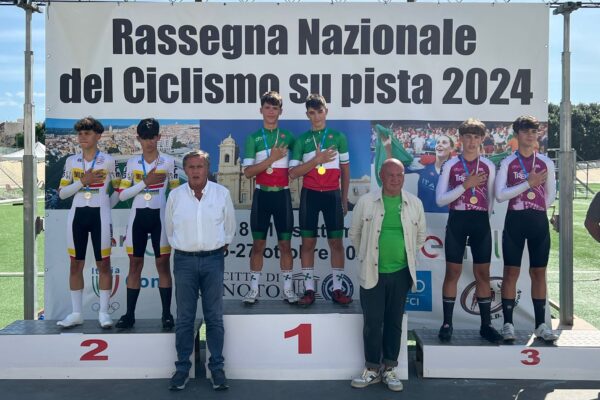 Si sono svolti a Noto, dal 15 al 18 settembre, i Campionati Italiani Giovanili su Pista che hanno visto l’assegnazione di 20 titoli italiani e la partecipazione di 174 atleti provenienti da tutta Italia. La parte del leone l’ha fatta la rappresentativa della Lombardia, in grado di portare a casa 11 titoli dei venti a disposizione. Seguono, nel medagliere, l’Emilia Romagna e Veneto, con tre titoli. Presenti durante tutte le giornate il vice presidente Carmine Acquasanta e il Segretario generale Tolu. (nella foto il podio della Madison Esordienti Uomini)