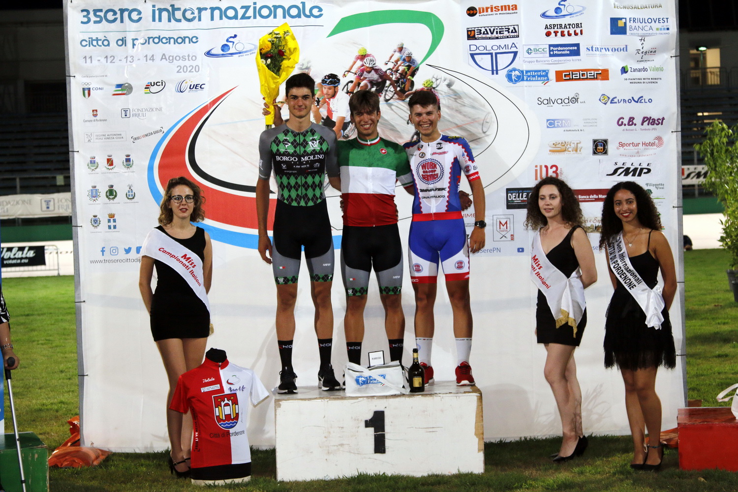 Il portacolori della Borgo Molino Rinascita Ormelle vince al Bottecchia di Pordenone e bissa il successo di qualche settimana fa ottenuto nella prova tricolore dell’inseguimento individuale; aggiunge così un’altra bella maglia verde-bianco-rossa alla sua bacheca di trofei. Seconda piazza per un altro portacolori della squadra trevigiana che in questa stagione sta facendo man bassa di vittorie, si tratta di Bruttomesso Alberto; chiude il podio Russo Vincenzo della Work Service Romagnano.