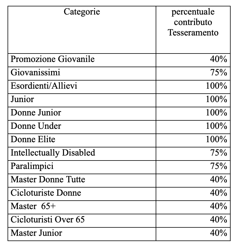 La tabella seguente indica le categorie interessate e la percentuale di contributo rimborsato sul costo della tessera:
