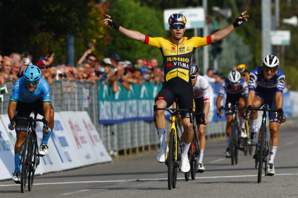 Un attimo per prendere le “misure” e l’ex iridato Alaphilippe con i suoi compagni Bagioli e Masnada, lancia il guanto della sfida immediatamente raccolto dai luogotenenti di Van Aert Tratnik e Benoot (Jumbo Visma) che portano il loro capitano in testa alla corsa. Anche Stefano Oldani (Alpecin Deceunink) che corre sulle strade di casa si accoda seguito anche da Scaroni (Astana), Albanese (Eolo Kometa) e l’elvetico Hirshi (UAE). Mancano circa 40 chilometri al traguardo quando Oldani si rialza mentre gli altri nove filano in perfetto accordo verso la città del Carroccio dove regoleranno i conti (agonisticamente) con una volatissima sull’ampio rettilineo del Viale Toselli e Wout Van Aert non lascia scampo a nessuno.