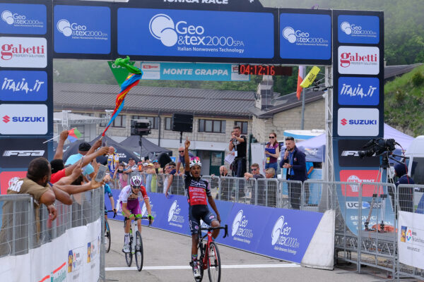 LA CRONACA – 114 i partenti da Castelfranco Veneto (Tv), dopo 20 km prende forma la fuga: ad animarla Matteo Zurlo (Zalf Euromobil Désirée Fior) – premiato come avvenuto nella prima tappa come più combattivo -, gli spagnoli Eugenio Sanchez (Kern Pharma) e David Lozano (Novo Nordisk), il colombiano Santiago Umba (Drone Hopper-Androni Giocattoli). A lavorare in gruppo la Bardiani CSF, cui si unisce l’Astana: il ricongiungimento avviene ai piedi della salita di Cima Grappa. La Bardiani CSF fa corsa dura: in testa allungano in 16, tra cui il leader della generale Christian Scaroni (Nazionale italiana). Il drappello – sempre sotto la spinta del Green Team con Samuele Zoccarato e Luca Covili – va via via diradandosi: ne fanno le spese, tra gli altri Scaroni e Lorenzo Fortunato (Eolo-Kometa), vincitore della AIR 2021. Negli ultimi 2 km rimangono in 5 a giocarsi la vittoria: e Covili e Zana, il kazako Vadin Pronskiy (Astana), Tesfatsion e il compagno di squadra ecuadoriano Jefferson Cepeda, tra i più attivi sulla salita finale. Il più lesto è l’eritreo, mentre Zana chiude secondo ed è il nuovo leader della generale: domani indosserà la maglia azzurra Geo&Tex 2000.
