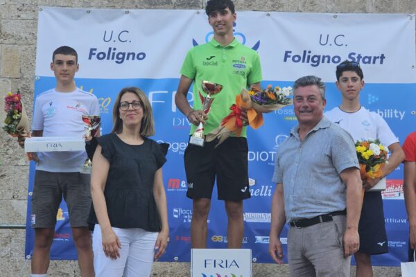 La perla più scintillante della due giorni è stata proprio quella firmata domenica da Laudi, che ha scelto la maniera più memorabile e roboante possibile per andarsi a prendere il suo primo successo stagionale. L’amerino classe 2006 ha infatti concluso in maniera vittoriosa una cavalcata solitaria di ben 90 km, avviata nel secondo dei dieci giri complessivi di gara. Il portacolori della società folignate, organizzatrice tra l’altro della manifestazione, è arrivato a toccare un vantaggio massimo sul gruppo di addirittura’, grazie anche al perfetto lavoro di copertura dei compagni nel plotone inseguitore. Lavoro coronato anche dallo splendido podio di Giacomo Serangeli, giunto 3° alle spalle di Fabrizio Laino (Team Veleka) nel primo drappello inseguitore, selezionatosi nelle ultime due tornate e composto da 12 unità. Festa grande per il gruppo diretto da Sandro Settimi, capace di piazzare al 6° posto pure Lorenzo Polise e confermatosi, dopo il podio centrato sempre da Laudi domenica scorsa a Sora, tra i team più in forma del momento. Titolo difeso quindi per la compagine nerazzurra, che conquistò il gradino più alto del podio anche nell’edizione del 2022 con Matteo Bennati.