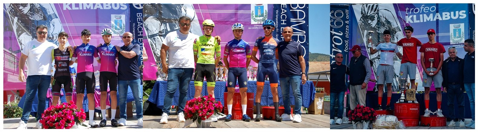 Un’altra brillante edizione del Trofeo Klimabus va in archivio per la gioia del patron dell'evento Nello Celano che ha visto oltre 200 ragazzi contendersi le vittorie nelle 3 gare del ricco programma allestito a SS Cosma e Damiano. Entusiasti anche i dirigenti della Logistica Ambientale Spezia Bike con in testa il presidente Marco Caruso che hanno firmato un’organizzazione complessa ma ben riuscita. Tutto è cominciato di buon mattino con la gara dei più giovani, quella degli Esordienti, impegnati su un circuito pianeggiante che ha portato inevitabilmente ad un arrivo a ranghi compatti. L’abruzzese Francesco Coletta (Mario De Cecco Logistica Ambientale) ha confermato il suo stato di grazia centrando l’ennesima vittoria stagionale davanti al compagno di squadra Riccardo D’Andrea. In terza posizione il campano Vincenzo Vito (Team Cesaro Franco Ballerini) davanti ai laziali Davide Sellati (Piesse Cycling Team) e Lorenzo Magrini (Pirata Cosmetall Vangi Sama Ricambi).  Fra le ragazze successi dell’Allieva Roberta Cesaro (Team Franco Ballerini) e dell’Esordiente Clelia Navarra (Cambike). Seconda gara di giornata per gli Allievi con una fuga di sette ragazzi che ha tenuto la testa della corsa fino all’inizio dell’ultimo giro quando Francesco Dell’Olio (Pirata Cosmetall Vangi Sama Ricambi) ha fatto il numero di giornata prima andando a raggiungere gli attaccanti e poi battendoli nella volta finale. Dietro di lui nell’ordine i coraggiosi protagonisti della fuga Valerio Ciceroni (Work Service Coratti), Daniele D’Alessio (Velosportsorani Mary J. Sweet Angel) e Damiano Ferrante (Pirata Cosmetall Vangi Sama Ricambi), quest’ultimo premiato anche come miglior primo anno. Le due gare mattutine facevano parte della challenge GP Ciclismo Oggi e Domani patrocinata dal Corriere dello Sport Stadio. Nel pomeriggio sono saliti alla ribalta gli Juniores che si giocavano la maglia di Campione Regionale. Una gara dominata dal Team Vangi Il Pirata con un finale in cui ha messo alla corda tutti gli avversari chiudendo con arrivo in parata dei suoi cinque ragazzi. A prendersi la vittoria è stato il pugliese Raffaele Cascione mentre il titolo regionale è andato ad Andrea Tarallo. Le altre posizioni erano per Marco Petrolati, Pietro Scottoni e Giacomo Serangeli.