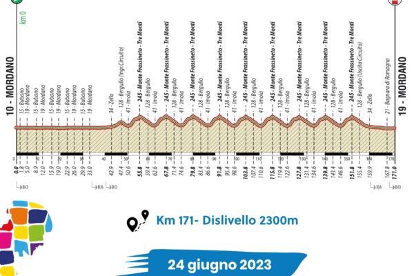 La salita misura circa 4 km, con pendenza media del 4% e due punte che toccano il 12% di pendenza massima; un’asperità abbordabile, con i suoi 250 metri di dislivello, ma che ripetuta per nove volte si farà sentire nelle gambe degli atleti. L’ultimo passaggio in cima (Monte Frassineto – Tre Monti) è a 20 km dall’arrivo di Mordano.