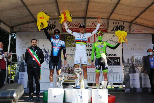 Il traguardo del Viale Verdi a Montecatini Terme sorride al Campione del Mondo under 23 Filippo Baroncini al quale gli organizzatori avevano riservato il numero uno in gara. Il numero due invece era sulle spalle di Michele Gazzoli compagno di squadra dell’iridato e vincitore in solitaria di questa corsa nel 2020. Ebbene eccoli Baroncini e Gazzoli in parata sul traguardo del Viale Verdi, tra gli applausi dei tanti sportivi presenti. Nessuna volata e Baroncini per primo sul traguardo con a fianco Gazzoli. Due autentici protagonisti finali ad esaltare la settantesima edizione del Gran Premio Ezio Del Rosso organizzato dal gruppo sportivo Le Casette con 110 corridori al via dei 125 iscritti e 63 che hanno concluso la gara lunga 184 chilometri e mezzo con 7 passaggi sulla salita di Vico. Quando la coppia del Team Colpack Ballan è entrata in azione è stato spettacolo puro e per gli avversari ogni tentativo di difesa è stato vano. La fiammante maglia iridata sulle spalle di Filippo Baroncini ha tagliato per primo la linea di arrivo nel Viale Verdi tra la comprensibile soddisfazione degli organizzatori che in cuor loro speravano che ciò avvenisse. Niente volata tra i due, che si sono guardati in viso tra gli applausi degli sportivi, dopo un finale di corsa straordinario. E sul podio i complimenti di tutti a ricordare la sua impresa in Belgio e questa esaltante affermazione in coppia con Gazzoli, dopo un finale in crescendo che ha messo fuori causa tutti gli avversari. Da notare che per la Colpack Ballan è stata la quarantesima vittoria stagionale e che Baroncini e Gazzoli 24 ore prima avevano fatto parte del quartetto dello squadrone lombardo che si è laureato campione italiano cronosquadre in provincia di Pordenone. Il primo toscano è stato Filippo Magli della Mastromarco Sensi Nibali giunto sesto e nella Top Ten anche il suo compagno di squadra Marcellusi. Lodevole la prova di Baseggio finito sul podio, e tra i primi anche Coati e Di Felice considerati tra i favoriti della gara. Buona infine la prova di Pirro. Martedì il Campione del Mondo sarà al via della 69^ Coppa del Mobilio in programma a Ponsacco con la gara in linea del mattino (124 Km con partenza alle ore 9) e la cronometro pomeridiana su di un nuovo tracciato di km 28,4 riservata ai primi 15 della frazione mattutina. Baroncini è tra i favoriti anche di Ponsacco, ed occhio a Coati, quarto a Montecatini e che vinse la Coppa del Mobilio lo scorso anno