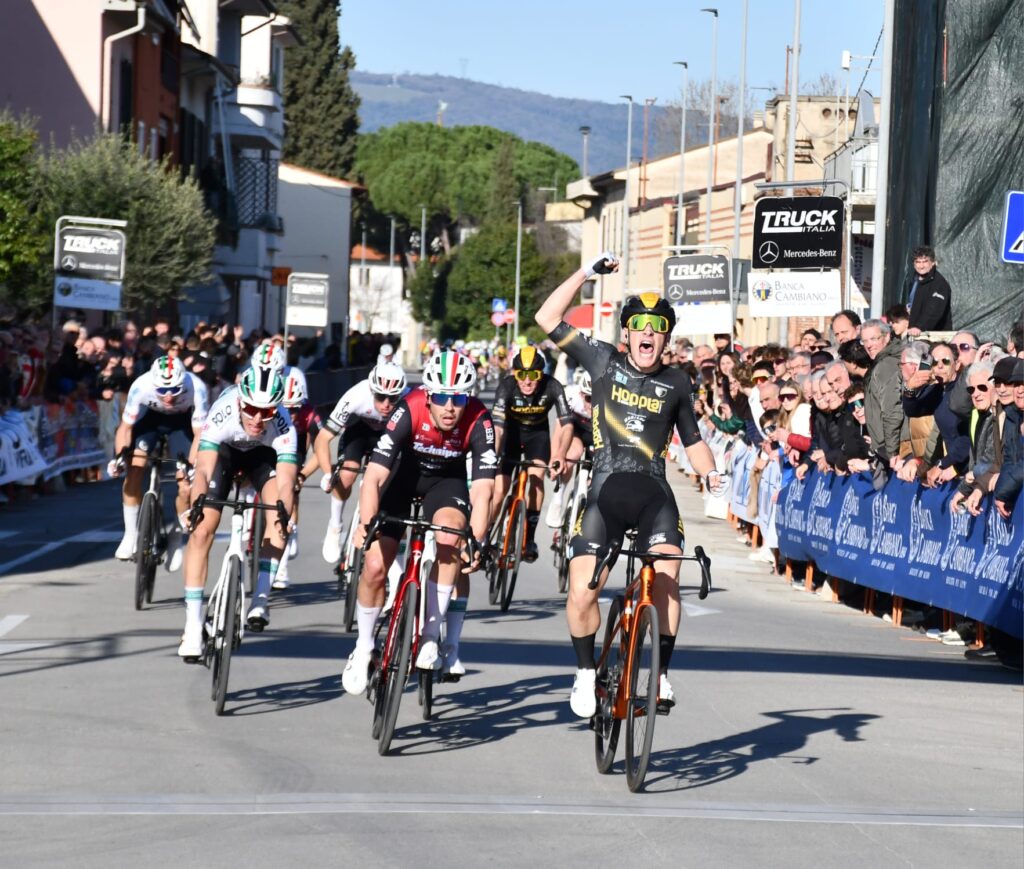 Empoli,21 febbraio 2026 – Una Firenze-Empoli trionfale per i corridori locali. Sul traguardo storico di via Carraia è salito alle stelle l’entusiasmo del clan del Team Hopplà con il patron Claudio Lastrucci in primis e quello degli sportivi di Fibbiana di Montelupo. A mettere in fila un drappello di una quindicina di corridori rimasti al comando dopo la salita de La Casetta a 4 Km dall’arrivo, è stato Lorenzo Magli che a fine 2025 aveva deciso di lasciare il ciclismo. Il successo che Lorenzo ha definito particolare è la conferma che la decisione poi ripensata per proseguire l’attività era quella giusta. Un Magli che ha sfoderato grinta e spunto irresistibile per avere ragione di due temibili avversari come Menghini, velocista di fama che su questo traguardo aveva vinto nel 2024, e un altro corridore locale, Riccardo Lorello, che abita a Limite sull’Arno e corre nella formazione veneta della S.C. Padovani. Per il vincitore i complimenti anche del presidente della Federciclismo Cordiano Dagnoni, del sindaco di Empoli Alessio Mantellassi e del presidente regionale del CONI Simone Cardullo. Alla gara 181 partenti di 31 squadre con via dal Piazzale Michelangelo a Firenze e gara che ha avuto per protagonisti nei primi 90 km Burani, l’inglese Torrison e Nocerino. Rientrata la fuga gara sempre veloce con vari tentativi di fuga. Nel finale provavano prima Palomba e poi Masciarelli con Cantoni, ma il gruppo era compatto all’inizio dell’erta La Casetta. Attaccava Lorello con estrema decisione e rispondevano prima Bambagioni e poi Bruno, quindi il rientro di una dozzina di corridori e la volata capolavoro di Magli tra l’entusiasmo degli sportivi. Impeccabile l’organizzazione della Maltinti Banca Cambiano.