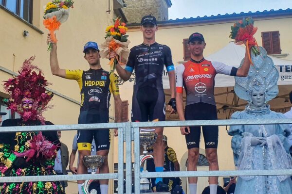 Castiglion Fibocchi,3 ottobre 2022 – Non aveva ancora vinta Matteo Milan in questa felicissima stagione del CTF. L’occasione dopo una gara da protagonista nel 71° Trofeo Festa Patronale-Trofeo Mario Zanchi a Castiglion Fibocchi, competizione organizzata dal G.S. Fausto Coppi Laterina e che ha ricordato oltre a Fosco Frasconi, Ezio Mannucci, storico tecnico del ciclismo dilettantistico italiano. Alla sua memoria la società organizzatrice con il presidente Apollo Solenni, il direttore organizzativo Sirio Chiodini ed i loro collaboratori hanno tenuto al mattino una cerimonia commemorativa nella Sala del Consiglio comunale alla presenza del sindaco Marco Ermini, del membro del direttivo dell’UCI Daniela Isetti, del vice presidente nazionale della Federciclismo Ruggero Cazzaniga, del consigliere nazionale Fabio Forzini, del presidente del CR Toscana Saverio Metti, del ct degli Under 23 Marino Amadori, degli ex professionisti Giovambattista Baronchelli e Rinaldo Nocentini. Dopo questa cerimonia la celebrazione di una Santa Messa presso il cimitero, mentre al momento della presentazione delle squadre ogni direttore sportivo ha ricevuto un attestato a ricordo di Ezio Mannucci. Alla corsa hanno preso il via 117 atleti ed è stata caratterizzata da una fuga protagonisti Milan, Fiaschi e Regnanti. Nel finale in evidenza anche Porta e Moro autori di una splendido recupero e successo finale di Matteo Milan che ha avuto ragione di Porta e Moro sul traguardo in salita della località aretina.